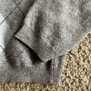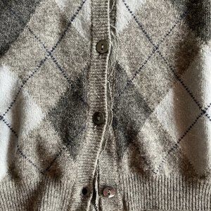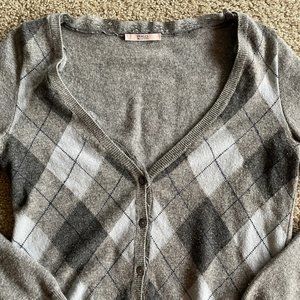 Valentino RED grey argyle wool cardigan. The v-neck has a grey lace trim. It’s great if you like the spring/summer 2025 argyle trend, late 90s or early 00s preppy.