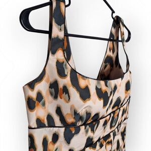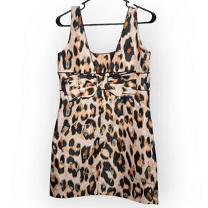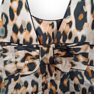 Features an absolutely stunning Taffeta printed animal print dress with a square neck and an accent back bow.