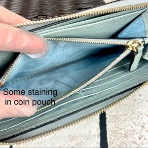 Inside coin pouch has left over staining from coins and cloth zipper rail shows tiny bit of darkening, mainly at corner edges. Not very noticeable though!