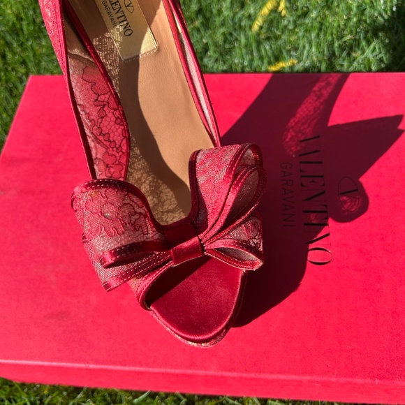 Valentino Red Lace Peep Toe Bow Heels size 38 1/2