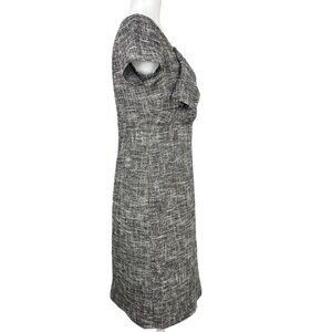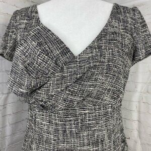 Red Valentino size IT 44/US 6 dress, it has a decorative bow v-neckline, short sleeves, tweed black and white color, shift pencil dress, thick fabric, lined, concealed back zip closure and back slit. Materials made in Italy shell 80% cotton,15% acrylic, 3% nylon, 2% elastane, lining 67% acetate, 33% polyester. Care dry clean only. Condition is preloved very good as shown in pictures. Valentino typically fits true to size, please preview the measurements to ensure fit. MFSR $1,150 Size 6 dress form used in photos.