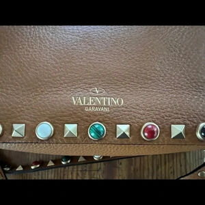 This is one of the most versatile handbags I have ever owned. It looks great with jeans and it looks fabulous for work. Beautiful brown saddle leather with Gem stones studs. Long studded shoulder strap. One zipper pocket inside. The inside and outside of the bag are in very good condition. Dust bag, certificate, and extra studs are included. Measurements are 6 x 4 x 3. .There are a few treasures in my closet that are not negotiable and this is one of them. Price is firm!