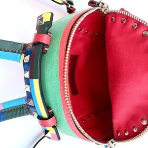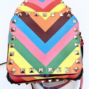 Valentino Rockstud 1973 collection mini backpack from resort 2015. Structured leather backpack in rainbow multicolor chevron stripe with silver studs. Preowned condition. Shows signs of use and wear including creasing on leather/straps, white spots/wear throughout surface of exterior, creasing on the straps, light spots/marks on front bag, light wear on shiny hardware, clean interior with a light wear. (See photos for condition and wear.) Missing luggage tag. Does not include dustbag, tags, or box.
