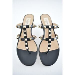Valentino Rockstud 50 Black Thong Backless Cage Strap Sandal Kitten Heel Pump 37