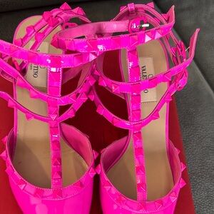 Authentic Valentino Garavani Rockstud Ankle Strap Pumps in a striking Bold neon pink heels. Features glossy patent finish and studded accents. Condition: GOOD.