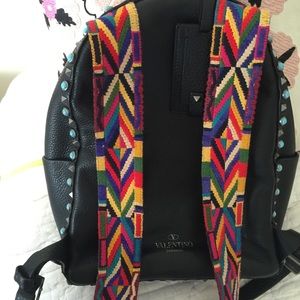 Black leather rockstud backpack with multicolor straps. Brand-new, with original tags and bag.