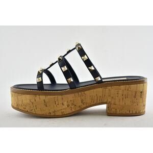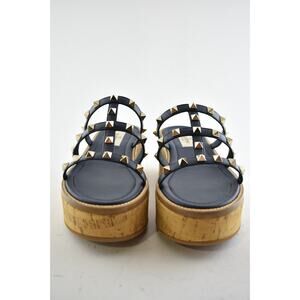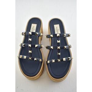 Valentino Rockstud Blue Cork Platform Mule Slide Sandal Block Heel Wedge 35.5