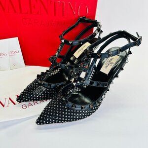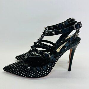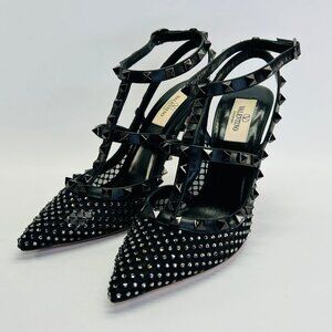 Valentino Rockstud Embellished Ankle Strap Pump Size 37 Black Studded Mesh Heel