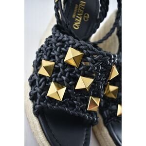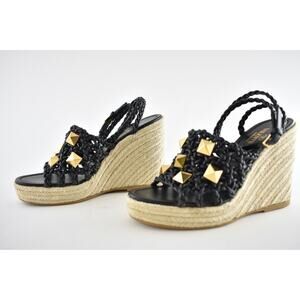 Valentino Rockstud Roman Stud Black Leather Espadrille Wedge Lace Up Sandal 37.5