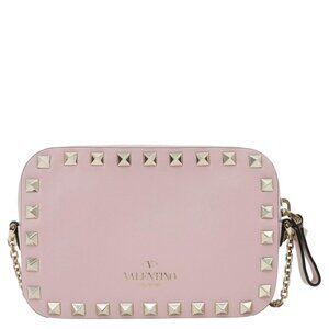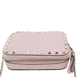 This VALENTINO camera bag features soft calfskin leather in a light pink hue, adorned with signature Rockstud details and a sleek chain strap. The small size is perfect for carrying essentials in stylish, feminine flair.