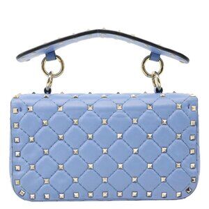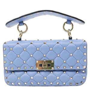 VALENTINO Rockstud Spike Small bag in quilted light blue leather with signature studs. Finished with a top handle and chain strap, perfect for chic everyday style.