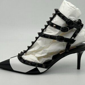Valentino Rockstud Studded Caged Checkerboard Sandals Pumps Heels Shoes The 'Rockstuds' on Valentino Garavani's pumps are meticulously applied by hand to achieve perfect placement. They've been made in Italy from black and white checked leather with caged ankle straps and pointed toes. The 65mm heels add moderate lift. Black and white leather pumps with tonal Rockstud trim. 2.5" heel. Pointed toe. Caged, T-strap vamp. Adjustable ankle strap. Leather lining and sole. Made in Italy. Size: 36.5 EU (Insole measures 9 5/8", Heel: 2.5"). Please keep in mind that the toe is pointed. Brand New In The Box with a Dust Bag.