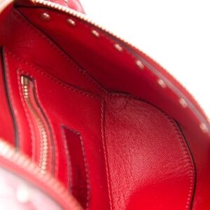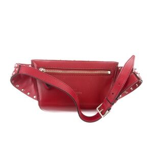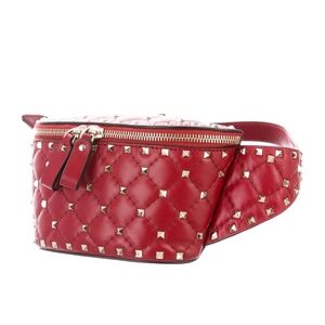 Red quilted leather Valentino Rockstud waist bag with gold-tone hardware, pyramid stud accents throughout, single exterior zip pocket, black leather lining, single zip pocket at interior wall, zip closure at top and buckle closure at waist strap. Includes dust bag and tags. Size 75.