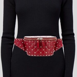 Red quilted leather Valentino Rockstud waist bag with gold-tone hardware, pyramid stud accents throughout, single exterior zip pocket, black leather lining, single zip pocket at interior wall, zip closure at top and buckle closure at waist strap. Includes dust bag and tags. Size 75.