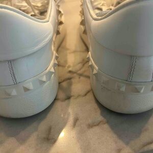 Valentino Garavani Rockstud Untitled sneaker in white calfskin, Platinum-finish studs on the band , Special label with the number 11 ,- Made in Italy These have been worn but lovingly taken care of. Wear shows mostly on the inside.