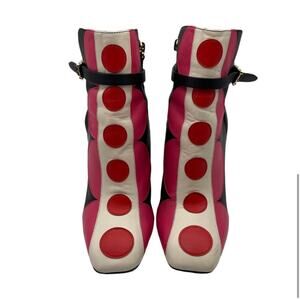 Valentino Garavani Runway Polka Dot Leather Ankle Boots in Multicolor. Features multicolor calfskin upper, ankle height, layered polka-dot pattern placed creatively , house's signature wraparound ankle strap with studded buckle, round toe squares off at front, dide zip for ease of dress, covered heel block heel, leather lined insoles. Scuffs on soles, some creasing and minor spots. One pull tab missing. Approx 4” heel. Retail $1800.