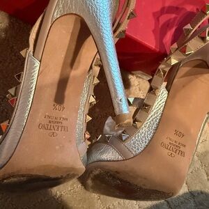 Classic Valentino rockstars heels. Silver color. Worn a few times. There is a small almost unnoticeable knick on the heel of one shoe. Comes with original box, space parts and dust bag. 4 inch heel.