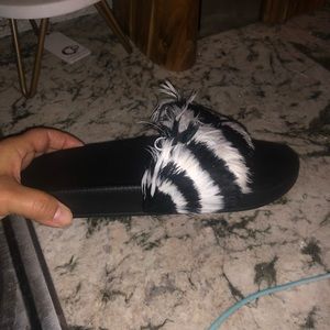 I bought these a while back and never wore them. I forgot i had them so they have been stored. They are goose feather and color of feathers are black and white. They are a size 37 which is a 7 US. If you are between sizes, these will fit: I’m a 7.5 and they fit fine.I don’t have the box but have a dust bag I can include.