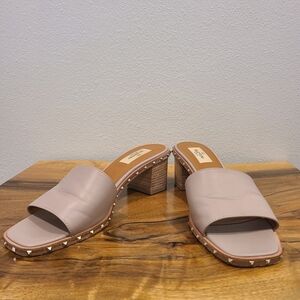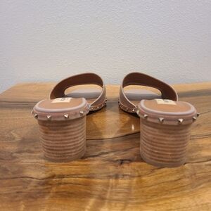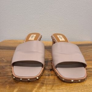 Valentino Soul Rockstud Slide Heeled Mule Sandal in Poudre. Valentino's signature pyramid studs encircle the sole of an Italian-crafted open-toe slide set on a modest block heel. These shoes are in great preowned condition, there is some creasing on the upper, some wear to the soles and small dents in the heel.