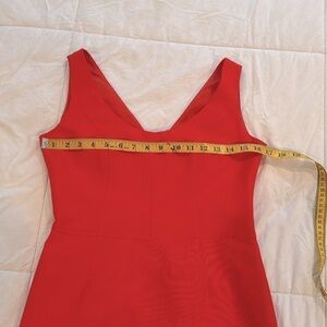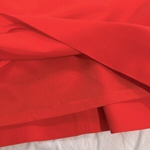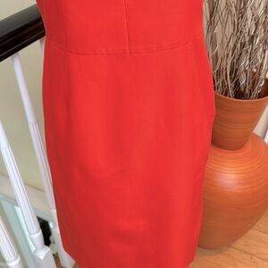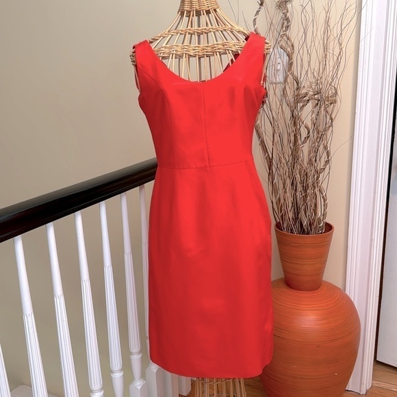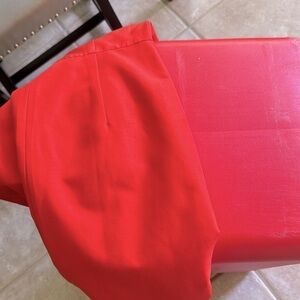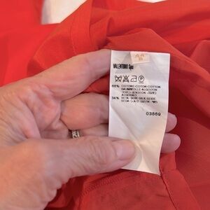 Gorgeous. It’s 66% cotton and 34% Silk Lining is 67% Acetate and 33% polyester. Has zipper on the side. Says 44-8 for size. Only has the tag on the inside lining. Color is more like the last photo it’s like a orange red color