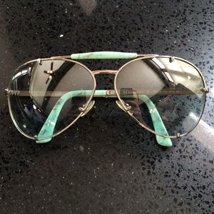 Metal aviator frames from Valentino STYLE : 1150/S COLOR : Silver frames with almost clear lenses green marble accents at bridge and earpieces CONDITION : hairline scratches on both lenses and frame all crystal embellishments around lenses are intact