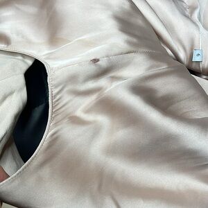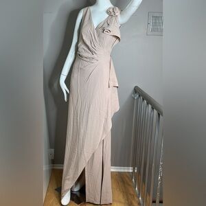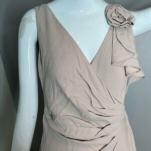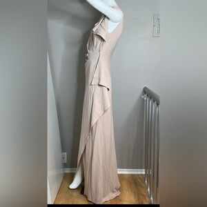 This is a gorgeous Valentino Sz 6 Silk Crepe Sleeveless Gown. Rouched front. Faux wrap effect. Original hem on the dress. There is some dust dirt on the very edging bit essentially unnoticeable once on, (as you’ll likely pick up dust dirt with that length). A bit of slight train. Back zipper. Interior is silk lined. The lining of the underarms interior does show some staining it’s faint but is there (from spray tan), unseen when dress is on.