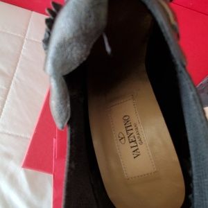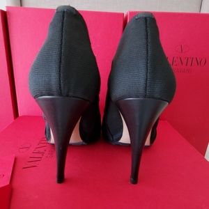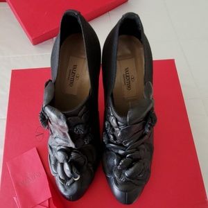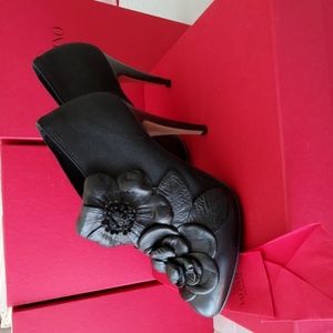 A distinctively Valentino bouquet of leather roses blossoms on the front of this well-fitting stretch bootie.