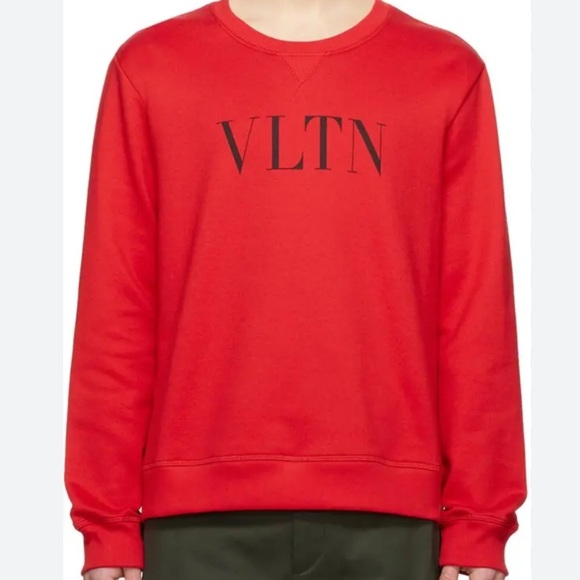 Bold red Valentino sweater with crewneck design. Features iconic VLTN logo. Stylish and comfortable.