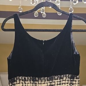 Elegant mini dress with a classic tweed pattern. Sleeveless and sophisticated. Ideal for chic events. Virgin wool with sparkles in the black tweed. Gorgeous elegance.