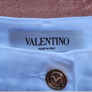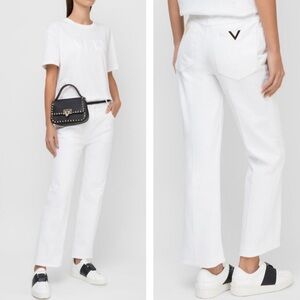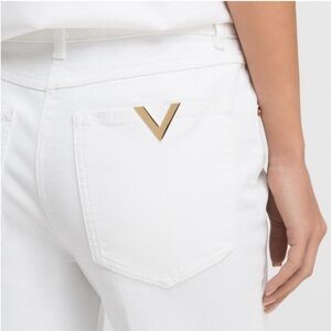 Elegant white denim featuring a signature gold button. Ideal for chic ensembles.