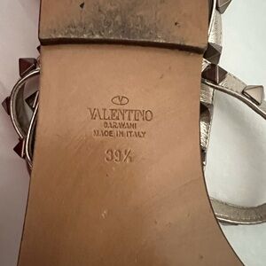 These Valentino flat sandals are a silver/gold metallic leather with iconic studded detailing along the T straps. Crafted for both elegance and edge, they offer a flat heel.