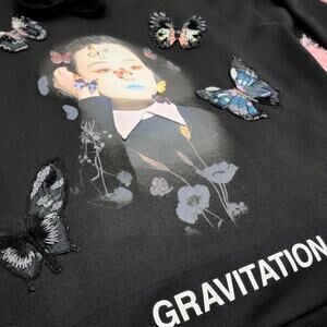 Known for her dreamlike, often humorous digital art, Miyazaki’s distinctive style blends seamlessly with Valentino’s luxurious craftsmanship. The hoodie features a bold central portrait of Miyazaki herself, adorned with multicolored embroidered butterflies, creating a whimsical, ethereal effect that embodies the theme of "Gravitation."