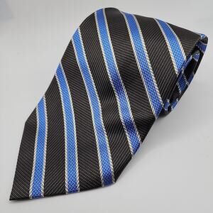 This is a designer striped Aurelio Valentino silk tie in blue, black and silver. It is a classic length and width tie. The tie is in like-new condition.