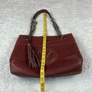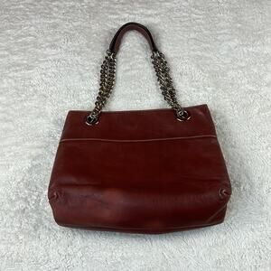 Brown leather tote bag with gold tone hardware. Features heavy chain and leather strap, leather tassel, and dual pocket magnetic closure. There is some discoloration/fading on lower back of bag, please see last pictures. I have dropped price for that.