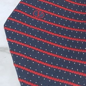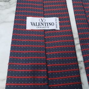 Fabulous Valentino red and blue Cravatte tie. Tie features white dot pattern to blend with numerous outfit to bring out your stylish side on any occasion. This tie