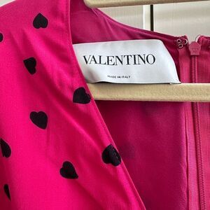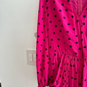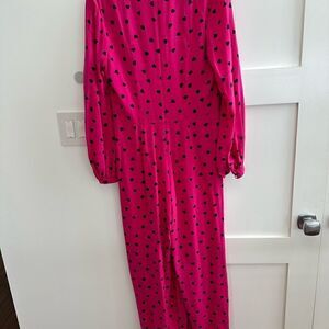 Valentino, hot pink and black heart polkadot jumpsuit in silk and elastane. Size 6. Never been worn. Total length is 55 inches. Length from waistband is 37 inches. Long sleeve with button closure. Super flattering and comfortable.