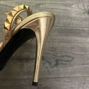 Valentino Garavani rockstud sandal heels in great condition other that the nick on the left heel and some light marking on the other heel as pictured. These are very comfortable and beautiful gold color that goes with all outfits. In great condition other than the nicks on the heels which I’m sure can be fixed at shoe cobbler.