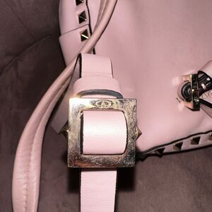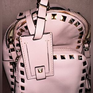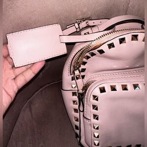 Presenting a stylish Valentino Garavani small backpack in a unique dusty pink/tan color, highlighted with gold-tone studs. This authentic piece is pre-loved but still in good condition, showing wear consistent with regular use.