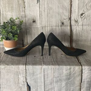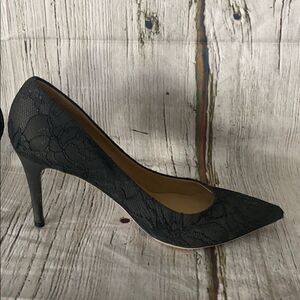 Gorgeous pure black designer heels in very good condition. Lace over leather design. Super clean interior. Wear on both toes. Soles in excellent condition. Minor wear on heel shaft. Heel height measures 3 1/2 inches. Gorgeous addition to your wardrobe. Smoke free home. Bundle and save! Check out my love notes!