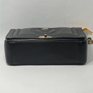 Leather flap bag featuring a logo at the front and an elegant turnlock clasp.