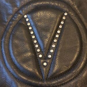Valentino by Mario Valentino Black Leather Double Strap leather and chain Bag. V In front made out of stones. Fringe tassel. Magnetic snap closure. Two inside zipper pockets. Gently used. Small mark on bottom otherwise excellent condition. Handle drop 11”. 14” across x 10.5” down. LB.