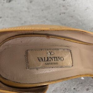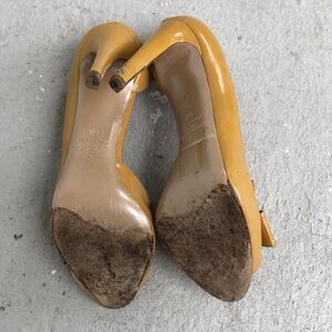 Please look at the pictures, these have color transfer on them but in the past I have had great success, dying patent leather shoes. There is a special technique. I did it myself. Also, the heel as a scuff in it and a good shoe man should be able to steam and re-glue. Heel height is 4 inches. Price to sell as is. Color is like a mustard tan