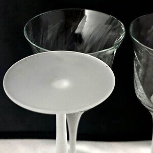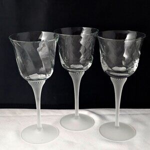 Elegant frosted wine glass set with optic swirl design and satin stems. Perfect for entertaining and special occasions.
