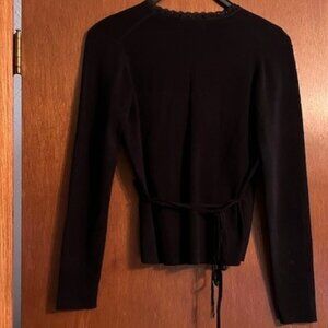 Valerie Separates Black v-neck dressy top size Medium. Lace and beads around neckline and front. Tie around waist. Must be a deep plunge neckline because my sister has the front pinned so it's not so open. 65% viscose, 35% nylon. Made in Taiwan & China. Dry Clean.