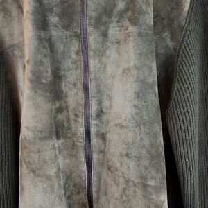 Gorgeous forest green suede leather & sweater combination sweater/ jacket. The front panels are 100% leather. The sweater portion consists of the sleeves, neck, & back and is a 70% blend of Merino Wool. Double front zipper. This is such a good quality sweater/jacket & in EUC.