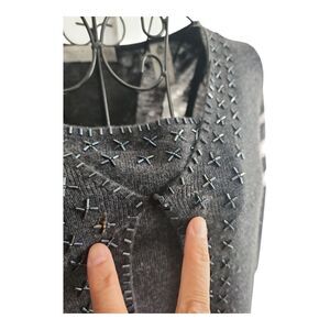 Both pieces are made of 100% pure merino wool in a versatile gray color with a subtle sheen. The set is embellished with unique, cross-stitched beading on the neckline, cuffs, and hemline, adding an elegant touch.