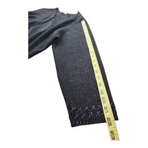 Both pieces are made of 100% pure merino wool in a versatile gray color with a subtle sheen. The set is embellished with unique, cross-stitched beading on the neckline, cuffs, and hemline, adding an elegant touch.