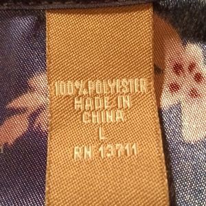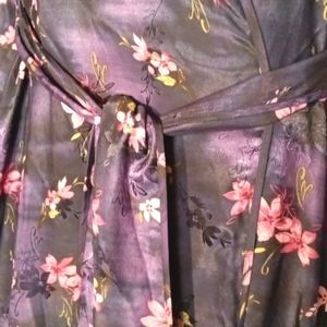 Deep purple satin like polyester printed with light purple flowers, deep side pockets and wide attached belt. This beauty has deep slits on the hem and is in excellent condition