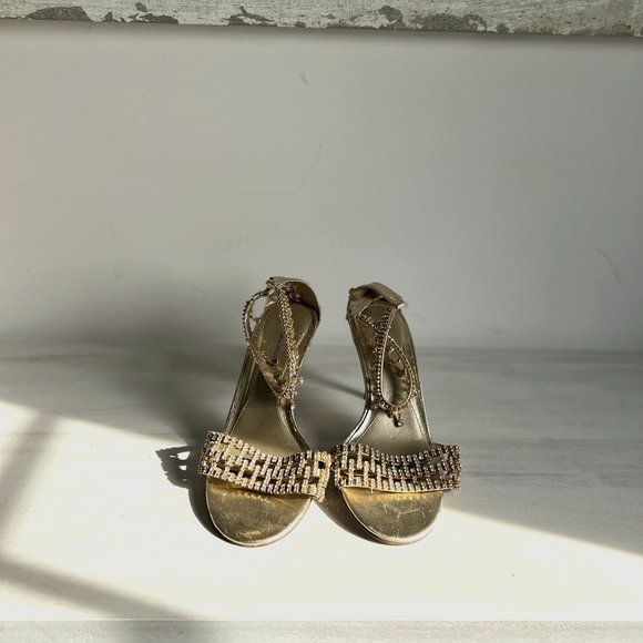 Valerie Stevens Gold Satin Pearl Toe High Heel Sandals