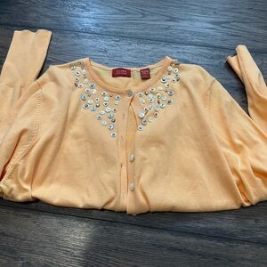 Elegant peach cardigan by Valerie Stevens. Adorned with metallic button details.